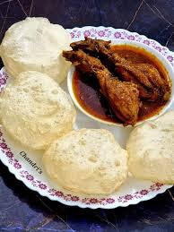 Hot, fluffy pooris fried to golden perfection, paired with a rich and flavorful chicken curry slow-cooked with aromatic spices