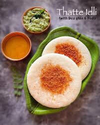 Oversized Thatte Idlis topped with spicy podi and ghee, balancing heat and richness in every bite.