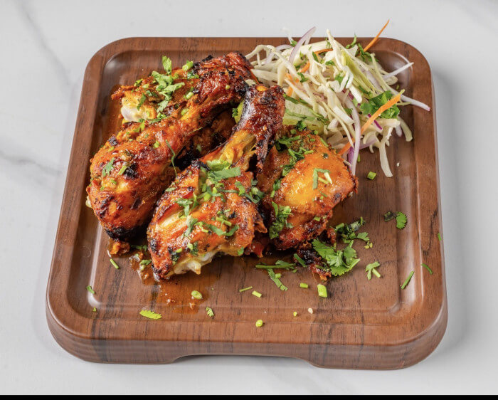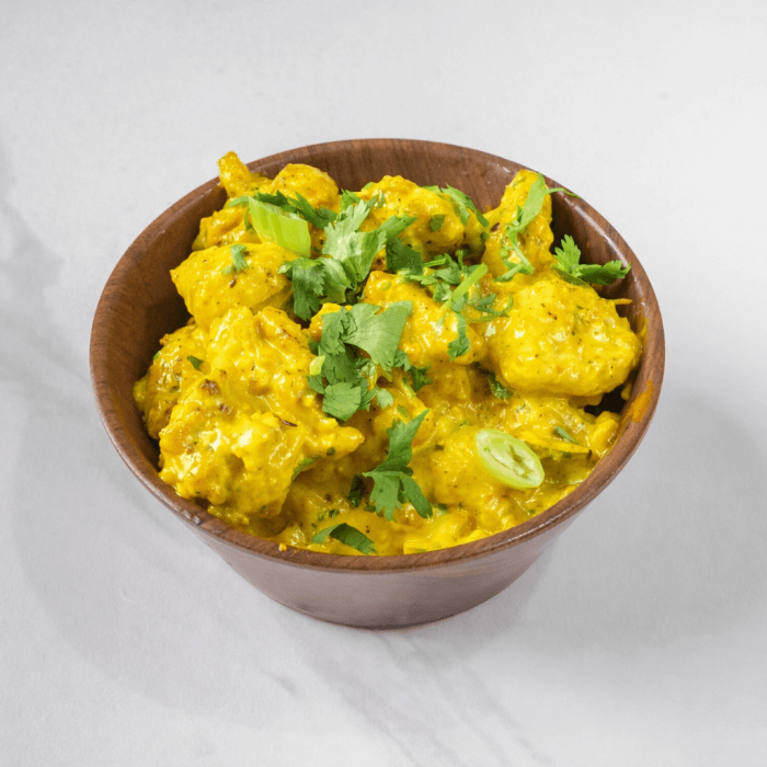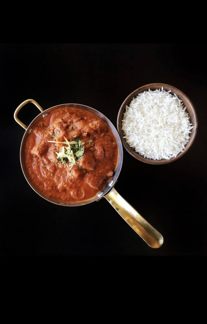 A crispy, Golden Dosa paired with a hearty, slow cooked goat curry infused with traditional spices and aromatic flavors.